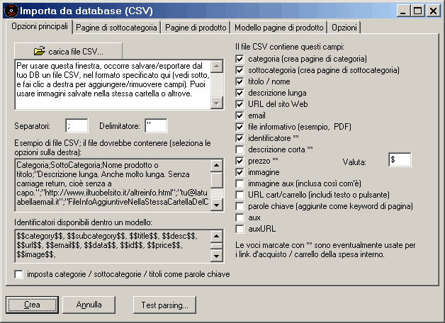Questa linguetta permette di decidere il formato del file CSV in ingresso: si scelgono i campi (a destra), il separatore e il delimitatore. Le impostazioni dell’intera finestra possono essere salvate nella linguetta
