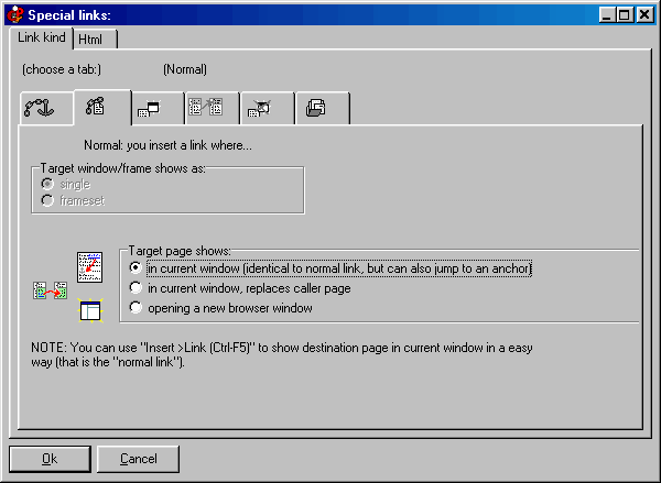 With this window you can define a link that (once clicked) will only replace the page in the current frame, rather than the whole frame set. Click on the image to get Help: